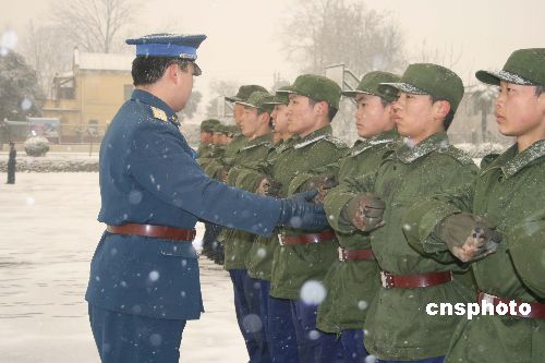 1月12日,西安下起2008年首場大雪,駐守陜西的空軍某部對新兵進行訓練。中新社發(fā) 尤中原 攝