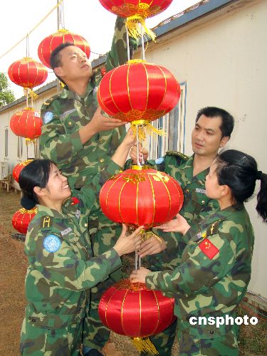 中國(guó)第三批赴蘇丹瓦烏維和部隊(duì)為使官兵在環(huán)境艱苦、條件惡劣的任務(wù)區(qū)度過(guò)一個(gè)祥和、愉快的春節(jié),堅(jiān)持以人為本,積極克服聯(lián)合國(guó)后勤供應(yīng)不及時(shí)的困難,立足現(xiàn)有條件、因地制宜,科學(xué)安排,勤儉節(jié)約,較好地保證了在春節(jié)期間,官兵飲食有保障,過(guò)年有氛圍。中新社發(fā) 劉恩海 攝