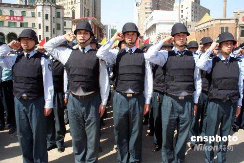 5月8日,遼寧省暨沈陽市保安系統(tǒng)奧運(yùn)安保誓師大會(huì)在中山廣場(chǎng)舉行。會(huì)上公安部門領(lǐng)導(dǎo)對(duì)保安提出要求,保安代表表決心,與會(huì)保安人員面對(duì)國(guó)旗和奧運(yùn)會(huì)會(huì)旗莊嚴(yán)宣誓:一切服從奧運(yùn)會(huì),誓保奧運(yùn)會(huì)的絕對(duì)安全。參加大會(huì)的有各級(jí)領(lǐng)導(dǎo)、各方面安保代表600多人。中新社發(fā) 劉寶成 攝