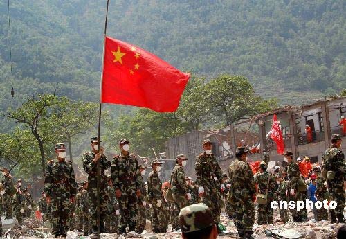 五月十九日下午兩點二十八分,在重災(zāi)區(qū)北川參與救援的武警四川總隊內(nèi)江市支隊一百余名官兵舉行降半旗儀式,為地震遇難者默哀。中新社發(fā) 陽年剛 攝