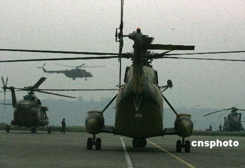 五月二十日,中央軍委調(diào)集四川省的四十一架軍方直升飛機轉(zhuǎn)場,飛抵離災區(qū)最近的綿陽國際機場,爭分奪秒赴災區(qū)救援。中新社發(fā) 賈國榮 攝