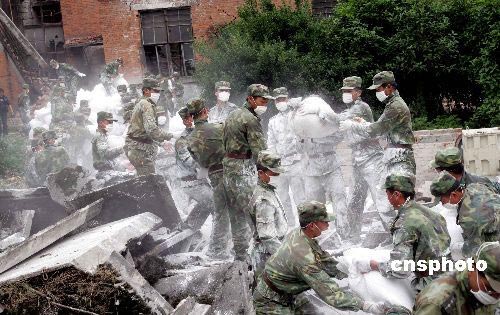 5月20日,濟(jì)南軍區(qū)某機(jī)步旅十二連官兵冒著中毒的危險,幫助四川省彭州市新科油化助劑有限公司緊急轉(zhuǎn)移增粘劑、阻燃劑等55噸有微毒的化學(xué)原料。官兵們在震塌的廢墟中仔細(xì)尋找、快速搶運(yùn),把散落的化工原料用袋子裝起來,為災(zāi)區(qū)挽回了300多萬元的損失。圖為官兵們搶運(yùn)時的情景。中新社發(fā) 施文標(biāo) 攝
