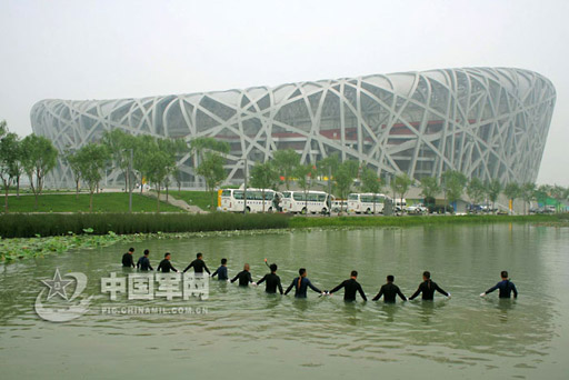 隨著北京奧運會的臨近,擔任援奧水下安檢的海軍南海艦隊某潛水分隊緊貼任務(wù)特點,苦練水下探摸本領(lǐng),為圓滿完成北京奧運重要場館水下探摸任務(wù)打下堅實基礎(chǔ)。圖為7月25日,蛙人官兵們正在對“鳥巢”周圍水系采取一字形地毯式全面搜索排查的鏡頭。 蒲豐 攝