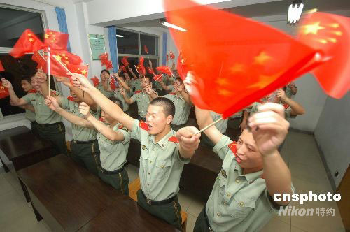 2008年9月25日晚,浙江臺(tái)州邊防支隊(duì)組織官兵收看“神七”發(fā)射實(shí)況直播。當(dāng)官兵們看到火箭成功點(diǎn)火升空時(shí),頓時(shí)揮舞起手中的五星紅旗熱烈地歡呼起來。中新社發(fā) 郟策 攝