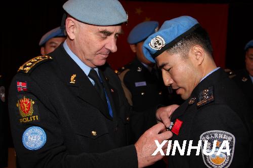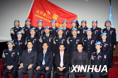 11月16日,中國第五批駐科索沃維和警察榮獲聯(lián)合國維和勛章的授勛儀式在科首府普里什蒂納舉行。第五批中國維和警察于2008年3月11日抵達(dá)普里什蒂納,執(zhí)行聯(lián)合國為期一年的維和任務(wù)。這支警隊(duì)是四川省公安廳受中國公安部委托單獨(dú)組建的。新華社記者連國輝攝