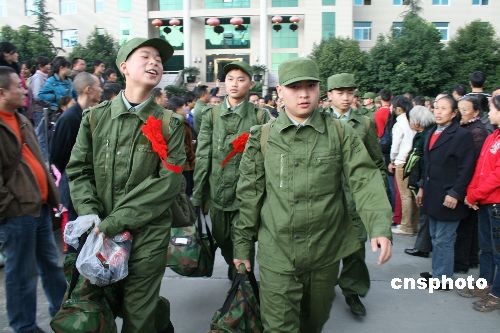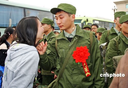 11月23日,四川眉山市首批奔赴西藏服役的新兵,告別家鄉(xiāng)踏上保衛(wèi)祖國的征程。在今年的冬季征兵中,作為地震災區(qū)的眉山市廣大適齡青年,被來到當地參加抗震救災的英勇的部隊官兵所感動,紛紛報名應征入伍,其中還有不少災區(qū)青年和在災區(qū)做志愿者的青年踴躍報名。中新社發(fā) 堯遙 攝