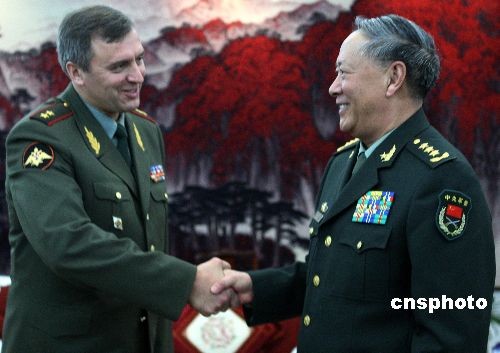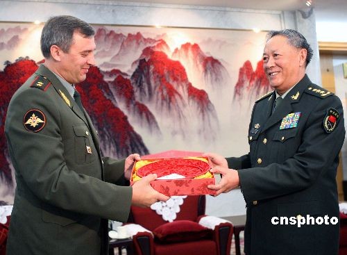 中央軍委委員、中國(guó)人民解放軍總參謀長(zhǎng)陳炳德上將,10月24日下午在北京八一大樓會(huì)見(jiàn)來(lái)訪的俄羅斯武裝力量第一副總參謀長(zhǎng)布魯京中將,雙方在友好的氣氛中進(jìn)行了交談。中新社發(fā) 宋吉河 攝