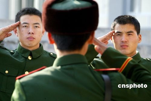 遼寧邊防總隊(duì)丹東邊防支隊(duì)退伍老兵在軍營(yíng)告別儀式上,向在中朝邊境值勤的戰(zhàn)友行軍禮道別。