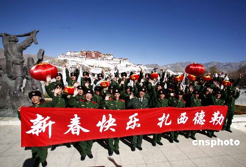 春節(jié)臨近,1月18日,武警西藏總隊(duì)拉薩市支隊(duì)一中隊(duì)官兵手捧哈達(dá)和紅燈籠,向全國人民祝賀新春快樂:扎西德勒。中新社發(fā) 趙艷志 攝
