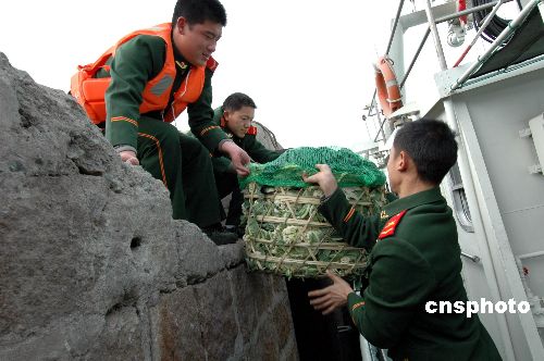 1月21日消息,春節(jié)即將來(lái)臨,浙江溫州邊防支隊(duì)給長(zhǎng)年駐守在遠(yuǎn)離大陸的海島官兵送去蔬菜、水果、飲料等各類食品,為海島官兵提前備好年貨。中新社發(fā) 吳水斌 攝