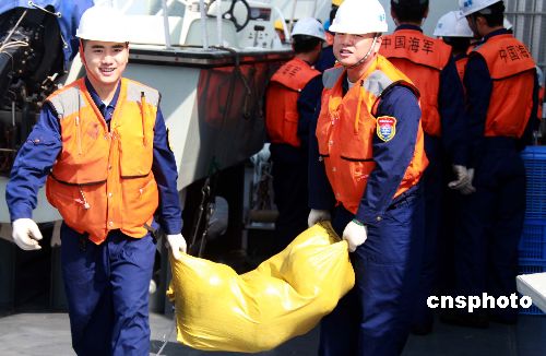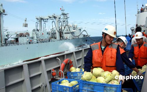 春節(jié)前夕,中國(guó)海軍艦艇編隊(duì)“?凇碧(hào)導(dǎo)彈驅(qū)逐艦與“微山湖”號(hào)綜合補(bǔ)給艦完成一次海上補(bǔ)給,圖為“?凇迸灩俦徇\(yùn)補(bǔ)給到艦上的“年貨”。中新社發(fā) 孫自法 攝