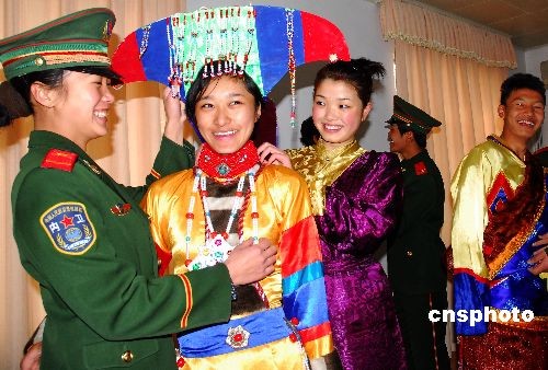 2月24日,武警西藏總隊(duì)的藏族官兵們穿著節(jié)日的盛裝,品嘗著精美可口的卡塞,跳起歡快的鍋莊,營區(qū)內(nèi)被濃濃年味包裹。該總隊(duì)為了讓藏族官兵們?cè)诰癄I里過上一個(gè)快樂祥和的新年(2月25日是藏歷新年),精心為他們準(zhǔn)備了酥油、糌粑、奶渣等節(jié)日佳肴,籌劃了形式多樣的藏文化活動(dòng),使藏族官兵們感受到了部隊(duì)的溫暖。圖為官兵們正在進(jìn)行精心打扮。中新社發(fā) 張權(quán) 攝
