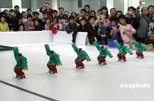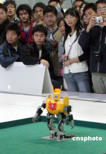10月26日,為期3天的2007“銀泉杯”中國(guó)機(jī)器人大賽暨Robo Cup中國(guó)公開(kāi)賽在濟(jì)南大學(xué)科技園開(kāi)幕。據(jù)了解,本次大賽共有來(lái)自國(guó)內(nèi)外的400多支隊(duì)伍1000余名選手參賽,大賽設(shè)置了34個(gè)比賽項(xiàng)目,包括Robo Cup機(jī)器人比賽、FIRA機(jī)器人比賽、空中機(jī)器人比賽、水中機(jī)器人比賽、舞蹈機(jī)器人比賽及雙足競(jìng)步機(jī)器人比賽等多種比賽類(lèi)型,是歷屆中國(guó)機(jī)器人大賽中比賽種類(lèi)最多和最全的一次。中新社發(fā) 龔輝 攝