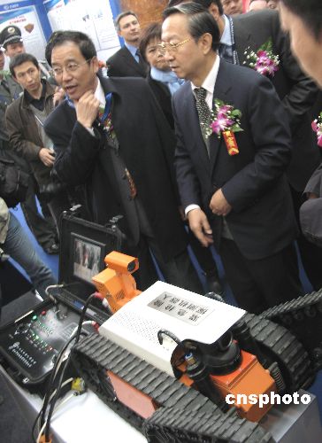 11月6日上午,“第十二屆中國國際煤炭采礦技術(shù)交流及設(shè)備展覽會”在北京全國農(nóng)業(yè)展覽館開幕。開幕式上,中國國家安全監(jiān)督管理總局局長李毅中來到1號展廳,在中國研制的首臺“緊急搶險探測機器人”前,詢問有關(guān)技術(shù)指標(biāo)。這臺由哈工大機器人研究所與唐山開誠公司共同研制的有線遙控機器人,可以在遇難、遇險礦井中行走500米距離,并可以爬坡、越障,到達指定地點,并探測井下有毒氣體、溫度、風(fēng)速數(shù)據(jù),對遇險礦工地段進行探測救險。中新社發(fā) 鄒憲 攝