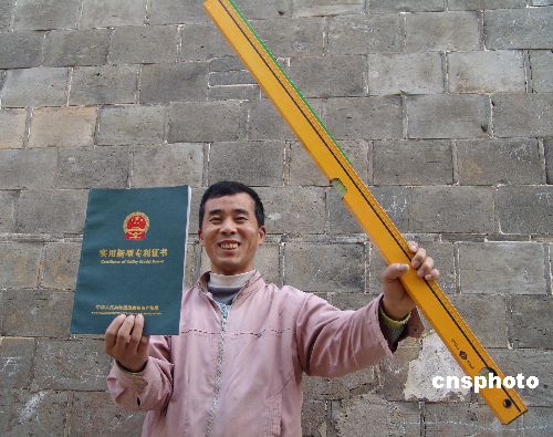 12月8日,程成高在展示他發(fā)明的“帶抹砂漿機(jī)構(gòu)的水平尺”。江西省樂平市后港鎮(zhèn)程家村農(nóng)民程成高,只有小學(xué)三年級文化,但他憑借自己的勤奮和智慧,克服困難,用4年的時(shí)間,發(fā)明了集抹砂漿與測量水平與一身的“帶抹砂漿機(jī)構(gòu)的水平尺”,并獲得了國家實(shí)用新型專利證書,成為當(dāng)?shù)剞r(nóng)民的典范。另外,他的又一項(xiàng)發(fā)明“滾輪式清掃畚箕”正在申請專利中。中新社發(fā) 石衛(wèi)明 攝