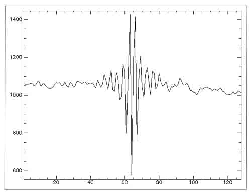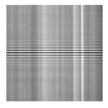 圖1、干涉圖(橫軸為空間像元,縱軸為干涉曲線采樣點(diǎn)數(shù),本圖是右圖從上向下第一行對(duì)應(yīng)干涉圖)