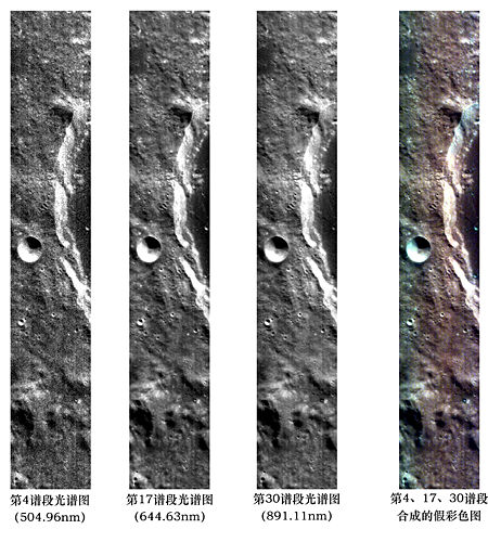 圖4展示的是11月27日04:54:27至04:56:10獲取的月表干涉成像光譜儀數(shù)據(jù)。該圖分別展示了32譜段中的第4、17、30譜段和它們合成的假彩色圖。