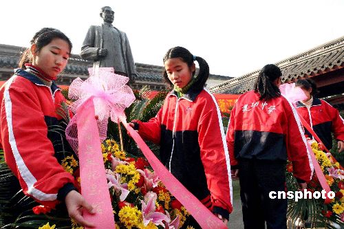 浙江紹興的中學(xué)生們向周恩來塑像獻花籃。