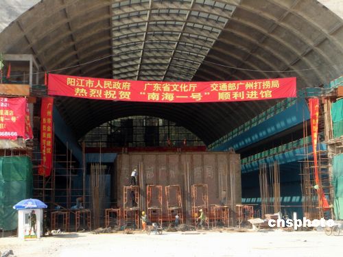 一月七日,“南海一號”入住的“水晶宮”開始封館,南墻開始建造,澆鑄鋼梁。為了保證施工質(zhì)量,南墻的建設(shè)工期需要兩個月左右!八m”南墻面向大海,高二十米,寬四十米,與其他三面墻一樣,南墻上部也有觀光走廊,游客可通過觀光走廊上的透明亞克力膠板觀看“南海一號”。南墻建好后,“水晶宮”馬上就可以引灌海水至十二米深,注入“水晶宮”的海水溫度、微生物生長情況等,都將與“南海一號”沉沒后的海域環(huán)境相同。中新社發(fā) 索有為 攝