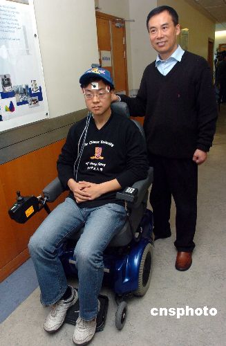 圖為徐揚(yáng)生教授〔右一〕向傳媒介紹其新研發(fā)的以頭部或眼球動(dòng)作操控的智能輪椅。
