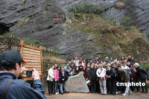 一月二十七日上午,兩岸三校師生在福建武夷山景區(qū)的大紅袍古老茶樹下合影留念。二十三日至二十七日,臺(tái)灣嘉義大學(xué)、臺(tái)灣屏東科技大學(xué)與福建農(nóng)林大學(xué)的四十位師生在此間開展茶文化之旅,探尋當(dāng)?shù)氐牟栉幕。中新社發(fā) 周文杰 攝