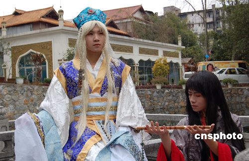 2月12日是農(nóng)歷大年初六,廣西南寧幾名高中學生在當?shù)氐拿褡逦奈镌吠嫫餭osplay(動漫真人秀),體驗另類春節(jié)的感覺。據(jù)悉,自一九九七年cosplay傳入中國以來,迄今全國有cos經(jīng)驗和參加過cos活動的人數(shù)在十萬以上。中新社發(fā) 劉萬強 攝