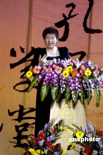 2008年4月5日晚,著名學者、北京師范大學教授于丹來到山東曲阜,作為剛剛開設的“孔子學堂”首位主講人登上杏壇的講臺!翱鬃訉W堂”是曲阜市與中華書局面向廣大普通游客和公眾開設的文化大型講座。今后每年的4月到10月,每月都將邀請一名專家主講,一名專家現(xiàn)場點評,通過和聽眾的問答互動,旨在弘揚儒學經(jīng)典文化。中新社發(fā) 張侃 攝