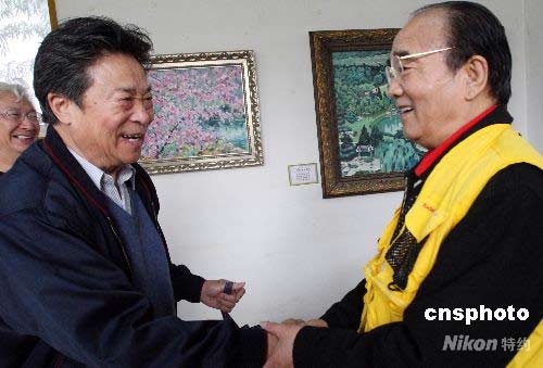 4月15日,以北京植物園景觀為專題的“王石之油畫展”在植物園盆景園內(nèi)開幕,是次畫展是由曾畫毛澤東巨像的中國著名畫家王石之創(chuàng)作完成,展出的40幅油畫都是以一畫一景的形式從植物園的春天到冬天不同季節(jié),不同區(qū)域的自然風(fēng)光、園林美景、人文古跡等優(yōu)美景觀。圖為李光曦(左)與高占祥出席開幕式。中新社發(fā) 錢興強 攝