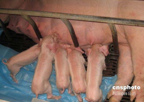 五月十七日上午,廣東省首例體細(xì)胞五頭克隆豬,在云浮新興縣廣東溫氏食品集團(tuán)有限公司水臺(tái)原種豬場集體亮相。十五日下午克隆豬誕生,其中最重的一只克隆豬為一點(diǎn)九公斤,一胎產(chǎn)下五頭存活“克隆豬” 為國內(nèi)之最。該“克隆豬”是溫氏集團(tuán)與中國農(nóng)業(yè)大學(xué)、華南農(nóng)業(yè)大學(xué)合作的成果,填補(bǔ)了該省在該領(lǐng)域的空白,也是繼北京、黑龍江、上海、廣西等地之后,在中國大陸第五個(gè)擁有體細(xì)胞克隆豬的省份,是國內(nèi)率先開展體細(xì)胞克隆豬研究的企業(yè)。中新社發(fā) 黃耀輝 攝