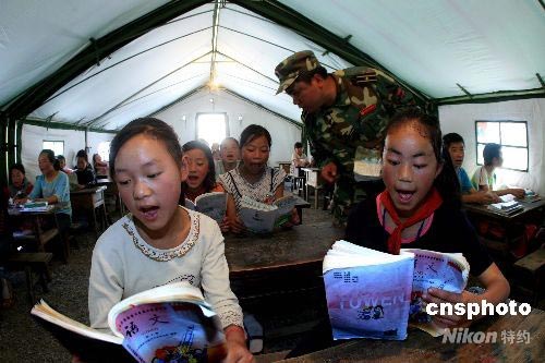 成都軍區(qū)駐渝某集團(tuán)軍官兵步行100余公里進(jìn)入茂縣后,進(jìn)村入戶組得知受5月12日地震的破壞,四川省茂縣宗渠村小的教學(xué)樓、住宿樓倒塌。學(xué)校的302名學(xué)生被迫停課。他們立即組織官兵搭制帳篷小學(xué),逐家逐戶走訪并告訴家長讓學(xué)生到帳篷小學(xué)上課,5月24日上午10時,在帳篷小學(xué)校長、駐渝某團(tuán)代副團(tuán)長嚴(yán)奎的宣布下,茂縣首座帳篷小學(xué)開課。中新社發(fā) 高效文 攝