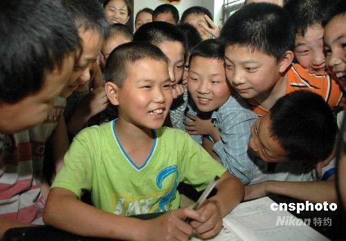 在孝德小學(xué)同學(xué)們的關(guān)懷下,來自四川災(zāi)區(qū)的藍(lán)宇難掩喜悅之情。