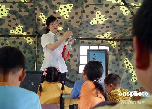 5月26日上午,志愿者楊棣茹在帳篷里為災區(qū)小朋友介紹有關飛機的科普知識。楊棣茹是廣漢中國民航飛行學院2005級大學生,“5.12”地震后,她報名參加了志愿者,成為救助中心的“老師”。在地震災區(qū)活躍著無數(shù)象她一樣的青年志愿者。中新社發(fā) 張鈺昱 攝