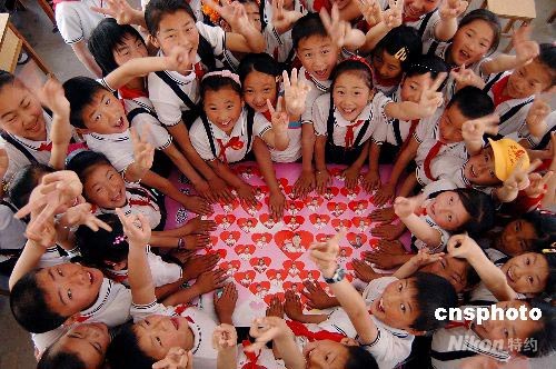2008年5月30日,來(lái)自四川綿陽(yáng)地震災(zāi)區(qū)、在日照市經(jīng)濟(jì)開(kāi)發(fā)區(qū)第二小學(xué)上學(xué)的3名學(xué)生,在新學(xué)校與老師同學(xué)們歡慶“六一”兒童節(jié)。日照經(jīng)濟(jì)開(kāi)發(fā)區(qū)第二小學(xué)的師生為3名同學(xué)送上精美禮物,祝福他們和四川地震災(zāi)區(qū)的小朋友節(jié)日快樂(lè)。近日,山東日照市教育部門(mén)安排3名投奔親友的四川地震災(zāi)區(qū)小學(xué)生就近在日照經(jīng)濟(jì)開(kāi)發(fā)區(qū)二小上學(xué),學(xué)校為這3名學(xué)生捐贈(zèng)了學(xué)習(xí)用品,并減免費(fèi)用。中新社發(fā) 陳為峰 攝