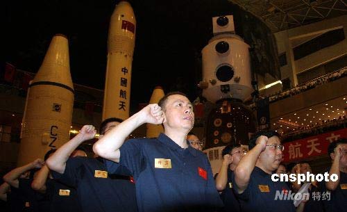 7月19日,伴隨著《飛得更高》的激揚(yáng)樂曲,用于發(fā)射“神舟”七號載人飛船的——“長征二號F”運(yùn)載火箭在中國運(yùn)載火箭技術(shù)研究院舉行出征儀式。經(jīng)過奮力拼搏,“神七”運(yùn)載火箭“長征二號F”已總裝完畢、整裝待發(fā),即將奔赴中國酒泉衛(wèi)星發(fā)射中心,執(zhí)行“神舟”七號載人航天飛行任務(wù)。圖為“長征二號F”運(yùn)載火箭總指揮劉宇(前左一)、總設(shè)計(jì)師荊木春(前左二)和火箭發(fā)射隊(duì)隊(duì)員一起宣誓出征。中新社發(fā) 孫自法 攝