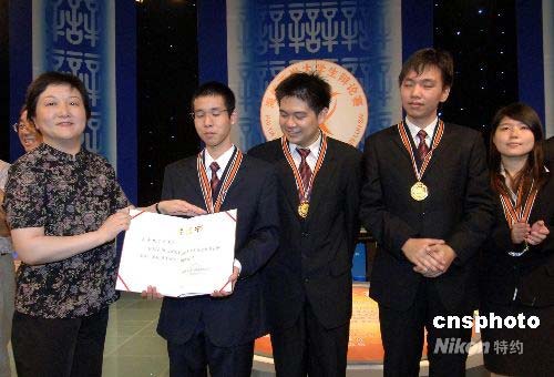 7月23日,中國(guó)科學(xué)技術(shù)協(xié)會(huì)書(shū)記處書(shū)記程?hào)|紅女士為榮獲第七屆海峽兩岸大學(xué)生辯論賽團(tuán)體冠軍的來(lái)自臺(tái)灣的東吳大學(xué)代表隊(duì)頒獎(jiǎng)。當(dāng)日,歷時(shí)3天的第七屆海峽兩岸大學(xué)生辯論賽在福州圓滿(mǎn)落幕。中新社發(fā) 劉可耕 攝