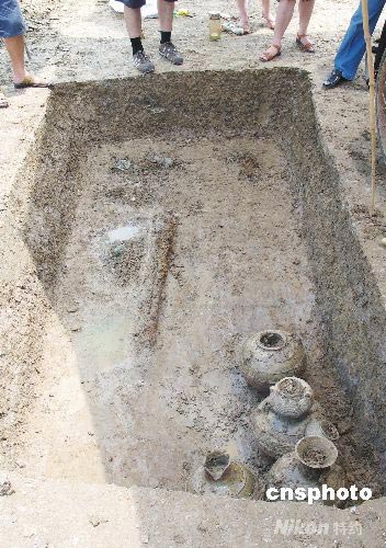 2008年7月24日,蘇州博物館考古工作者對蘇州相城區(qū)古宮黃泥村的一座西漢古墓進(jìn)行發(fā)掘,該古墓出土了一批墓葬品,共有3組6件,包括青銅鏡、陶壺、陶瓿和陶罐以及釉陶,都是兩個一對的組合,不僅器形較大,釉色更好,而且保存完好。據(jù)了解,該墓葬長3.15米,寬1.60米,被確定為西漢時期,墓葬規(guī)模以及隨葬品都超過以往發(fā)現(xiàn)的同年代墓葬,具有一定的價(jià)值。中新社發(fā) 朱子寒 攝