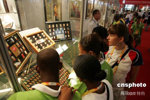 8月11日,奧林匹克青年營營員們參觀中國嘉德奧運專場拍賣會預展,小營員們在預展的紀念章展臺前專注觀看。本次拍賣會拍品將包括來自海內外藏家的體育題材的藝術品、奧運郵品、奧運紀念品和收藏品三大門類近300件精品。這次拍賣的重頭之一是是以靳尚誼為代表的寫實畫派所創(chuàng)作的著名奧運人物肖像,其中包括《薩馬蘭奇》肖像、《羅格》肖像、《女排團體》畫像以及1984年至2000年五屆奧運會全體中國奧運冠軍和著名教練員的肖像。除此以外,多屆奧運會傳遞火炬,簽名球、簽名衫和與奧運相關的奧運紀念郵冊、紀念幣、珍貴照片、書籍等眾多精品也將亮相上拍。中新社發(fā) 楊可佳 攝