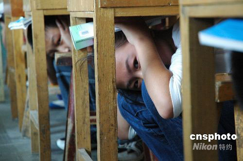 9月16日,山東臨沭縣臨沭鎮(zhèn)中心中學(xué)的學(xué)生在該縣武裝部工作人員指導(dǎo)下進(jìn)行防空襲逃生演練。中新社發(fā) 呂永國(guó) 攝
