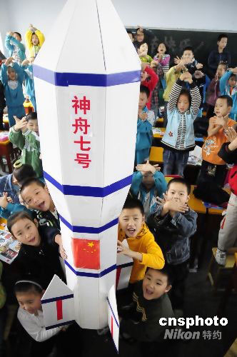 9月25日,河南省南陽市第四小學三(1)班的學生們制作了一只“神舟七號”,預祝我國的“神七”發(fā)射計劃圓滿成功。中新社發(fā) 付海厚 攝