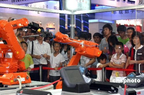第十屆中國國際高新技術(shù)成果交易會10月12日在深圳正式開館迎客。在上屆首次設(shè)立機(jī)器人展備受追捧的基礎(chǔ)上,本屆高交會機(jī)器人專展在展出規(guī)模和層次上又有提高,以工業(yè)機(jī)器人、民生機(jī)器人、特種機(jī)器人、青少年機(jī)器人等多部分展示來自兩岸三地,以及日本等國的中外著名大學(xué)、研究機(jī)構(gòu)、高科技企業(yè)在該領(lǐng)域的成果。圖為兩臺六軸機(jī)器人在乒乓球上表演寫字“手藝”,吸引著觀眾。中新社發(fā) 凌風(fēng) 攝