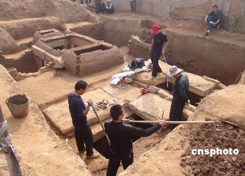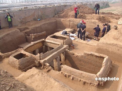 10月15日,考古人員正在挖掘漢墓。近日,在山東省沂南縣磚埠鎮(zhèn)發(fā)現(xiàn)占地約3000平方米的東漢家族墓葬群,經(jīng)過(guò)上級(jí)部門批準(zhǔn),考古人員對(duì)其中兩座墓穴進(jìn)行了搶救性科學(xué)挖掘,目前已經(jīng)發(fā)掘出土8件釉陶壺在內(nèi)的大量文物,墓內(nèi)石壁上有多幅畫像,清晰可見(jiàn)。中新社發(fā) 杜昱葆 攝