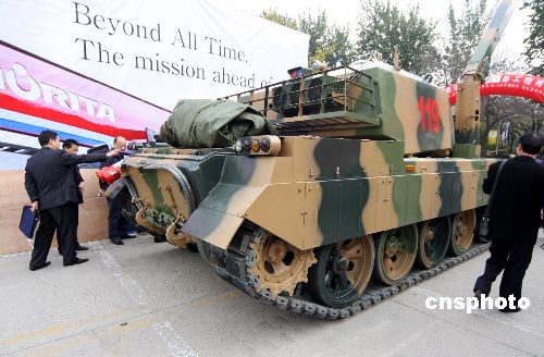 10月28日,一輛軍綠色、價值300多萬元的“消防坦克”亮相2008北京國際消防設(shè)備技術(shù)交流展。據(jù)悉,消防坦克是由中國軍用坦克改裝而成的。它采用特種裝甲鋼板制成,自重大約35噸,裝配有直流有線電控自動炮、高壓水泵、可燃和有毒氣體探測儀及防火直流照明燈,馬力很大,最高時速可達(dá)70多公里。中新社發(fā) 吳芒子 攝