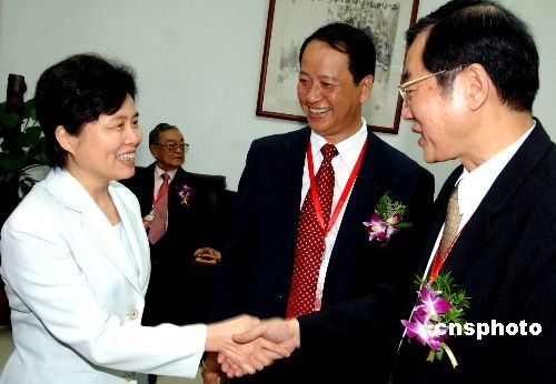 圖為出席該學(xué)院建校五十周年慶祝大會(huì)的中共福建省委常委、福建省副省長兼中共福建省委教育工委書記陳樺(左一)親切問候臺(tái)灣中國醫(yī)藥大學(xué)校長黃榮村。