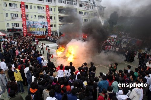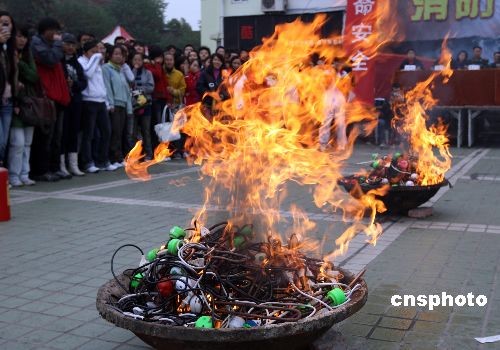 為汲取上海商學(xué)院“11.14”重大火災(zāi)事故教訓(xùn),11月22日上午,湖北三峽大學(xué)舉行了消防安全宣傳活動(dòng)。組織學(xué)校師生開(kāi)展了滅火逃生疏散演練,現(xiàn)場(chǎng)還對(duì)收繳的1000余支“熱得快”進(jìn)行銷毀,提高師生的消防安全意識(shí)。中新社發(fā) 方佩 攝