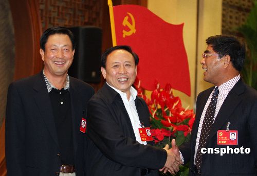 中國(guó)共產(chǎn)黨第十七次全國(guó)代表大會(huì)10月21日上午在北京人民大會(huì)堂閉幕。圖為中海油總經(jīng)理傅成玉(右)、中國(guó)化工集團(tuán)公司總經(jīng)理劉德樹(shù)(左),向當(dāng)選新一屆中央委員會(huì)委員的中國(guó)核工業(yè)集團(tuán)公司總經(jīng)理康日新表示祝賀。中新社發(fā) 任晨鳴 攝