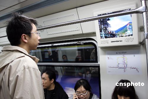 10月24日,北京市民在地鐵里通過移動電視觀看“嫦娥一號”奔月實(shí)況。北京時間十八時零五分,中國在西昌衛(wèi)星發(fā)射中心用“長征三號甲”運(yùn)載火箭將“嫦娥一號”衛(wèi)星成功送入太空。據(jù)悉,這次新聞頻道將連續(xù)三天推出“嫦娥一號”特別節(jié)目,市民還可以通過中央國際網(wǎng)站和CCTV無線互聯(lián)網(wǎng)觀看奔月盛況。中新社發(fā) 鄭雄增 攝