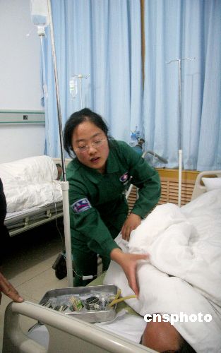 醫(yī)護(hù)人員在為獲救的船員檢查體溫。