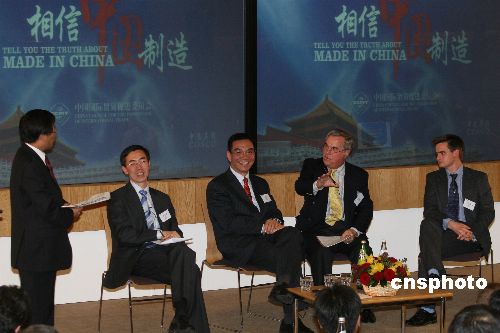 圖為英國(guó)諾丁漢大學(xué)教授姚樹潔 、中國(guó)駐英使館政治參贊劉為民、北京大學(xué)中國(guó)經(jīng)濟(jì)研究中心主任林毅夫、英中貿(mào)易協(xié)會(huì)主席白樂(lè)威和英國(guó)諾丁漢大學(xué)講師薩瑟蘭(自左至右)就“中國(guó)制造”的話題進(jìn)行討論。