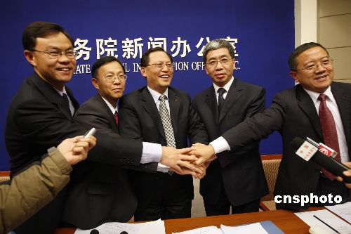 11月26日下午,繞月探測(cè)工程領(lǐng)導(dǎo)小組副組長(zhǎng)、國(guó)防科工委副主任、航天局局長(zhǎng)孫來燕(中),繞月探測(cè)工程測(cè)控系統(tǒng)副總指揮、北京航天飛行控制中心主任朱民才(左二),繞月探測(cè)工程副總指揮、航天科技集團(tuán)公司副總經(jīng)理雷凡培(右二),中國(guó)科學(xué)院空間科學(xué)與應(yīng)用中心主任吳季(右)以及國(guó)新辦新聞局副局長(zhǎng)華清(左),在國(guó)務(wù)院新聞辦公室舉行的新聞發(fā)布會(huì)上,共同慶祝中國(guó)首次月球探測(cè)工程的圓滿成功。當(dāng)日,國(guó)務(wù)院新聞辦公室邀請(qǐng)中國(guó)繞月探測(cè)工程領(lǐng)導(dǎo)小組副組長(zhǎng)、國(guó)防科工委副主任、國(guó)家航天局局長(zhǎng)孫來燕等介紹中國(guó)首次月球探測(cè)工程等方面情況,并答記者問。中新社發(fā) 杜洋 攝