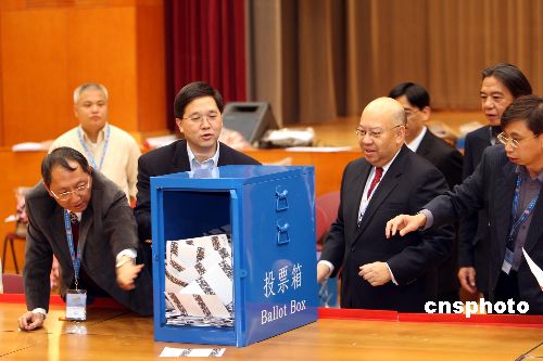 12月2日深夜,香港政制及內(nèi)地事務(wù)局局長林瑞林[左二]、香港選舉管理委員會主席彭鍵基法官[右]到社區(qū)綜合大樓點(diǎn)票站視察點(diǎn)票情況。此次香港立法會港島區(qū)補(bǔ)選共有八名候選人競逐一個議席,分別是:柳玉成、李永健、蕭思江、葉劉淑儀、蔣志偉、凌尉云、陳方安生、以及何來。